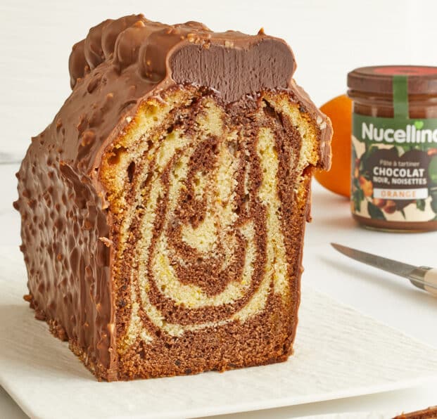 Préparer la ganache : faire fondre le chocolat. Faire bouillir la crème et verser en 3 fois sur le chocolat. Quand la ganache est homogène, ajouter le beurre, mélanger et ajouter la pâte à tartiner. Laisser prendre la ganache au frais avant de pouvoir la pocher sur le cake.