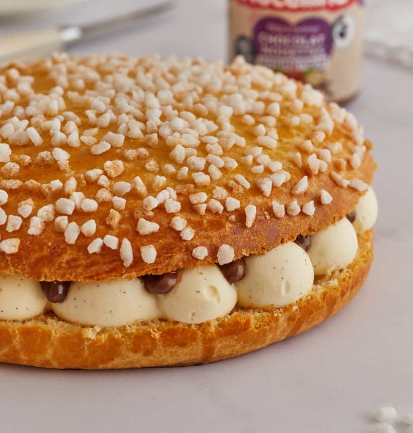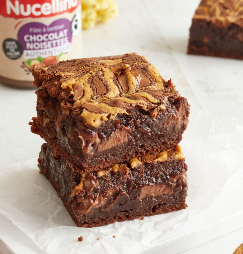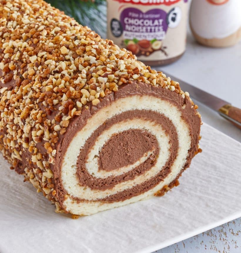 Le biscuit : La ganache Nucellina : (à réaliser la veille)•130 g de chocolat noir 52 ou 55 % de cacao•130 g + 265 g de crème liquide 30 % de M.G.•195 g de pâte à tartiner Nucellina Authentique Le montage :