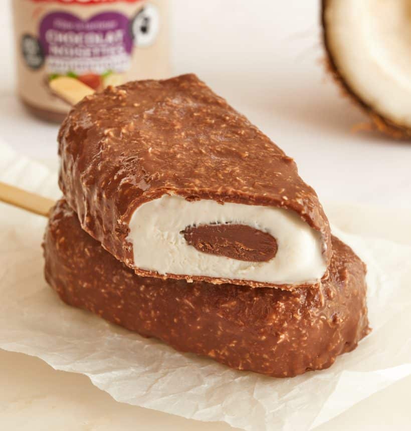 95 g de lait concentré sucré 150 g de crème de coco bien froide Pâte à tartiner Nucellina Monter au fouet électrique la crème de coco, puis l’ajouter au lait concentré sucré. Verser la préparation à mi-hauteur des moules à esquimau, laisser prendre 15 minutes au congélateur, pocher de la pâte à tartiner Nucellina au […]